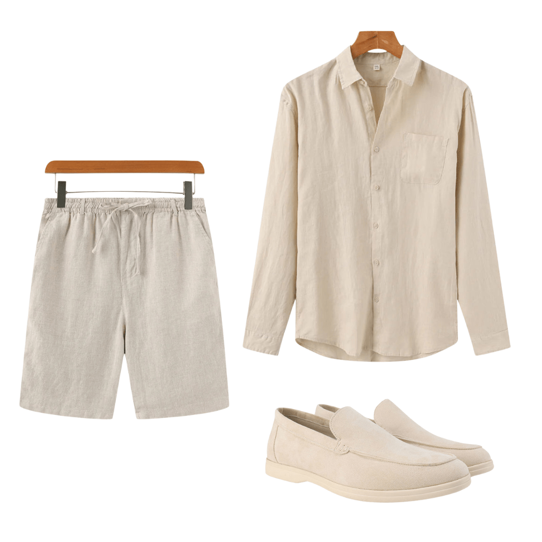 THE MALLORCA outfit embodies the essence of minimalist luxury. Crafted from soft linen and suede, this collection features a classic 100% linen shirt, relaxed linen shorts, and refined suede loafers—all in neutral beige tones that speak to those who appreciate quiet sophistication and understated style.